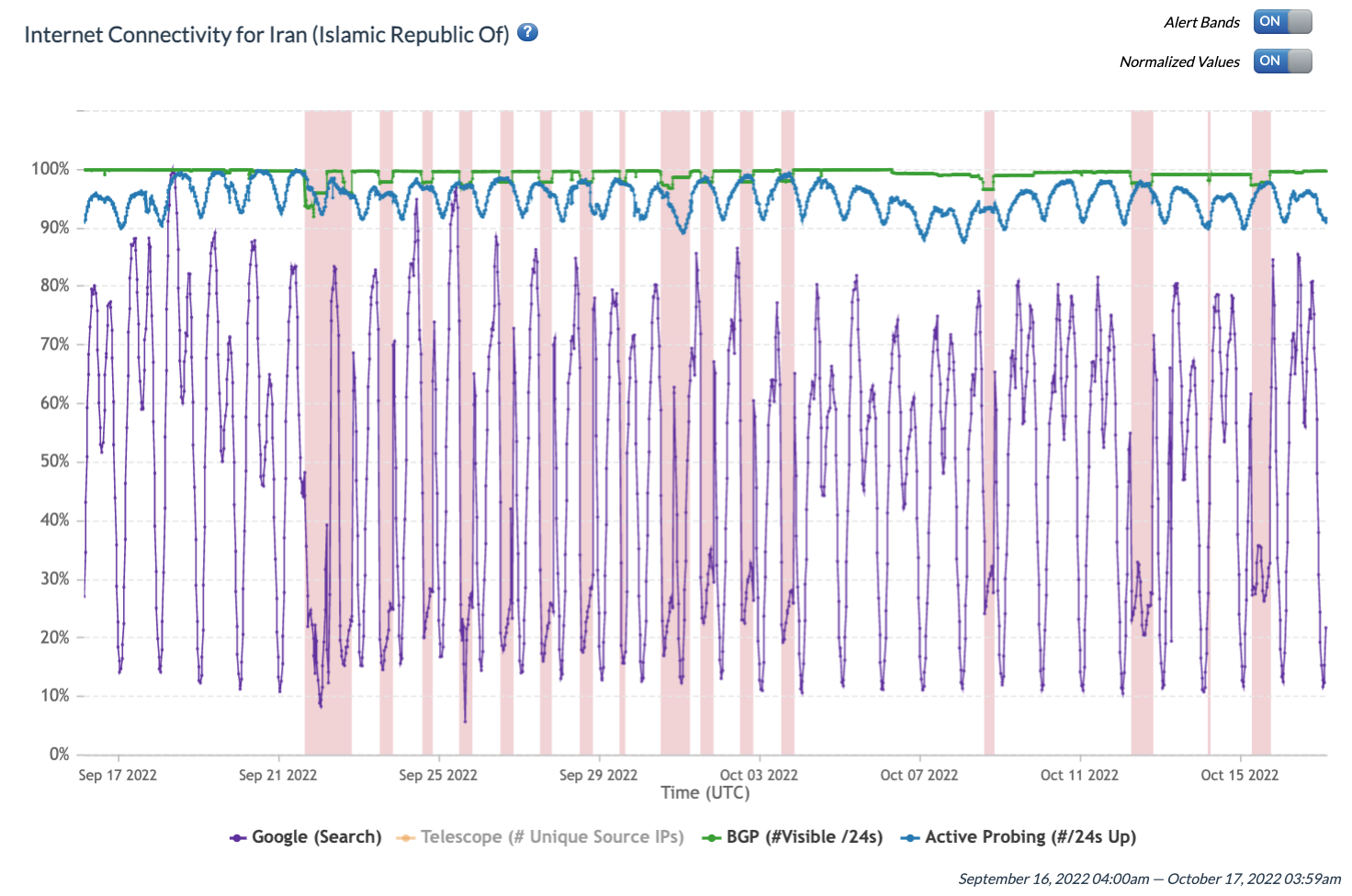 Figure 1: IODA data showing Internet outages in Iran between 16th September 2022 to 16th October 2022 (source: IODA). The red vertical bands indicate outages, which are detected as abnormal drops in the green “BGP” signal. The BGP data source represents routing announcements or global routing information that each ISP router exchanges with other routers, and it is usually quite stable. An abnormal drop can indicate a disruption in Internet connectivity. During the digital curfews, the blue Active Probing and purple Google search signals (see Methods below) are not reaching the maximums they normally would. (IODA’s “telescope” signal is removed from the time series for this view as it does not provide additional information.)