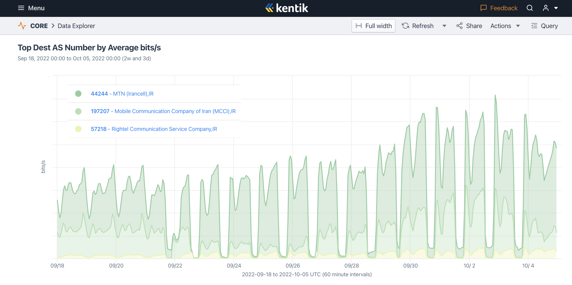 Figure 5: Graph showing Kentik traffic volumes for the Iranian three mobile carriers Irancell (dark green), Rightel (yellow), and MCI (light green) between 18th September 2022 and 5th October 2022 (source: Kentik).