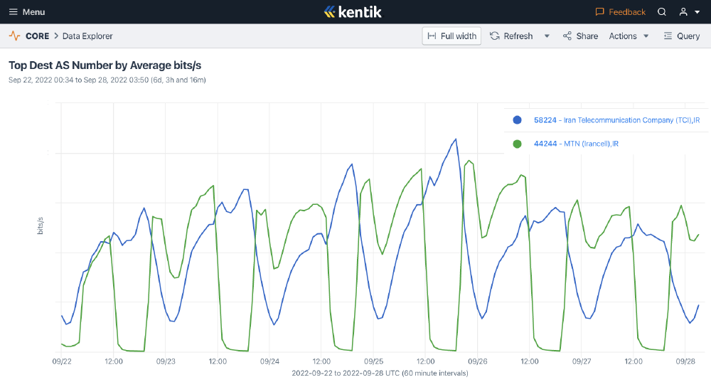 Figure 6: Graph showing Kentik traffic volumes for Iran’s largest wireline carrier (TCI, in blue) surging during shutdowns of Iran’s largest mobile carrier (Irancell, in green) between 22nd September 2022 and 28th September 2022 (source: Kentik).
