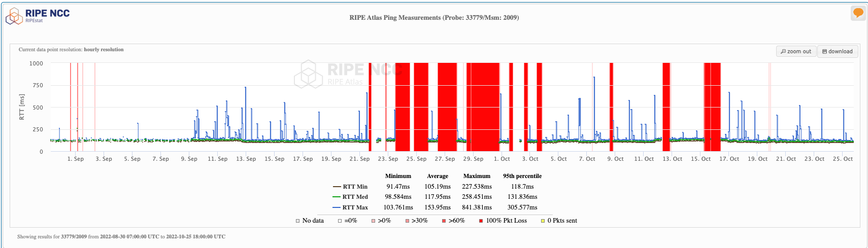 Figure 10: Ping measurements towards the IPv6 address of one of the a.root-servers.net root DNS resolver (source: RIPE Atlas). Red blocks indicate times when the resolver’s IPv6 address could not be reached.