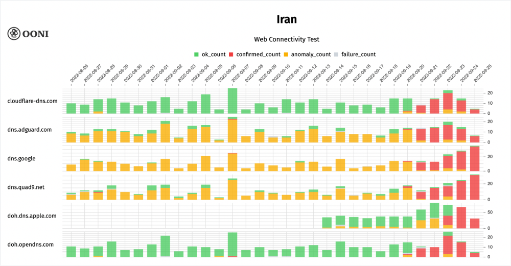 Figure 12: OONI data on the blocking of popular DNS over HTTPS endpoints in Iran between August 2022 to September 2022 (source: OONI MAT).