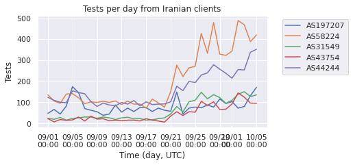 Figure 14: Number of speed tests per day since September 1, 2022 for five ISPs. Iran Telecommunication Company PJS (AS58224) is shown in orange; Irancell (AS44244) is shown in purple. (Source: M-Lab).