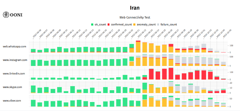 Figure 17: OONI data on the testing of WhatsApp Web, Instagram, Viber, Linkedin and Skype in Iran between September 2022 to October 2022 (source: OONI MAT).