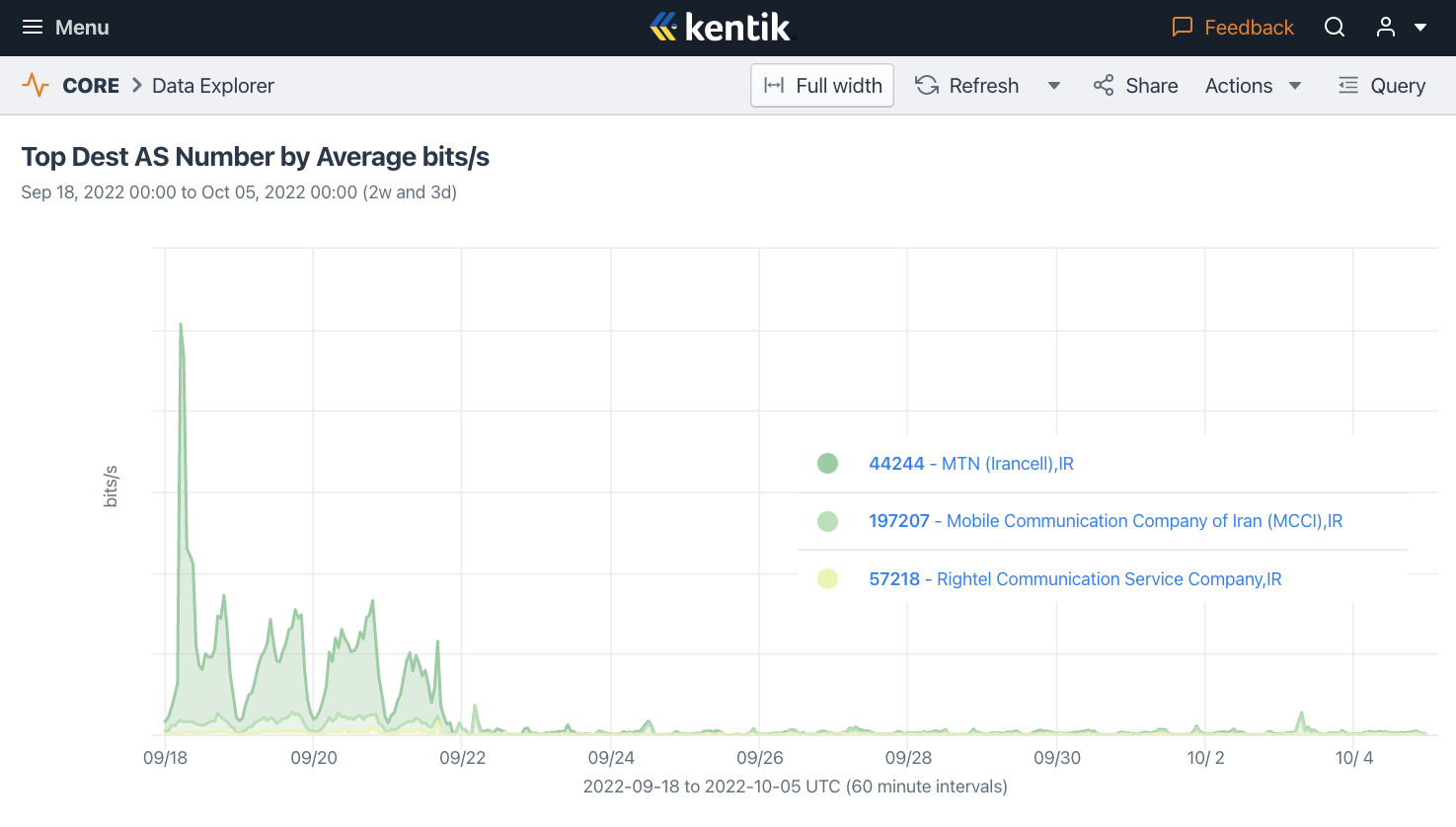 The mobile network outages are further corroborated by Kentik data (Figure 5), which shows daily drops in traffic from Irancell, MCCI, and RighTel during the same date range.