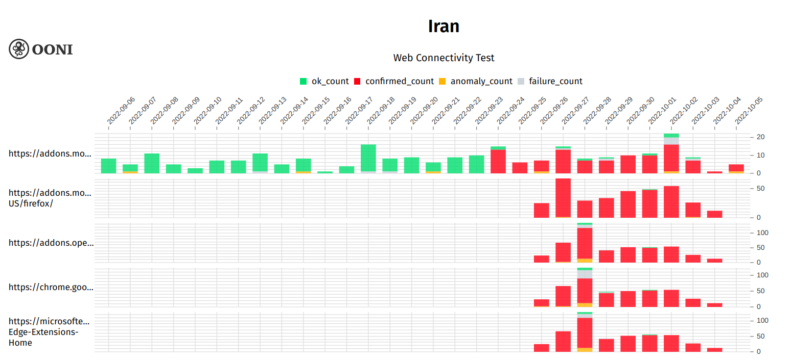 Figure 21: OONI data on the testing of browser extensions in Iran between September 2022 to October 2022 (source: OONI MAT).
