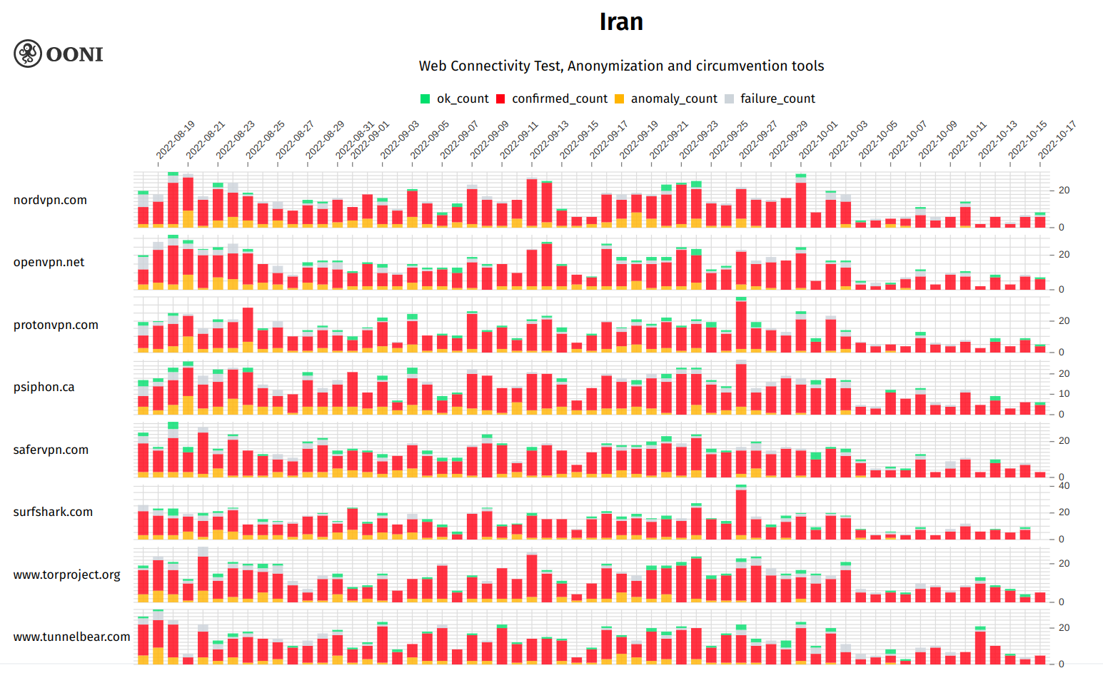 Figure 22: OONI data on the blocking of circumvention tool websites in Iran between 18th August 2022 to 17th October 2022 (source: OONI MAT).