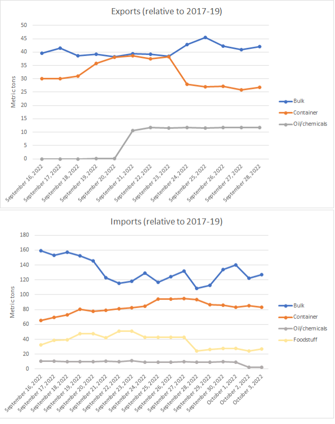 Data on exports and imports by volume of goods is presented in Figure 25. Viewing just the data for September 2022 or October 2022 may provide an incomplete picture, since we need to know how much trade has changed relative to business-as-usual. To capture this, we need to look at how much trade is taking place following the shutdown relative to how much trade would normally take place during this time.