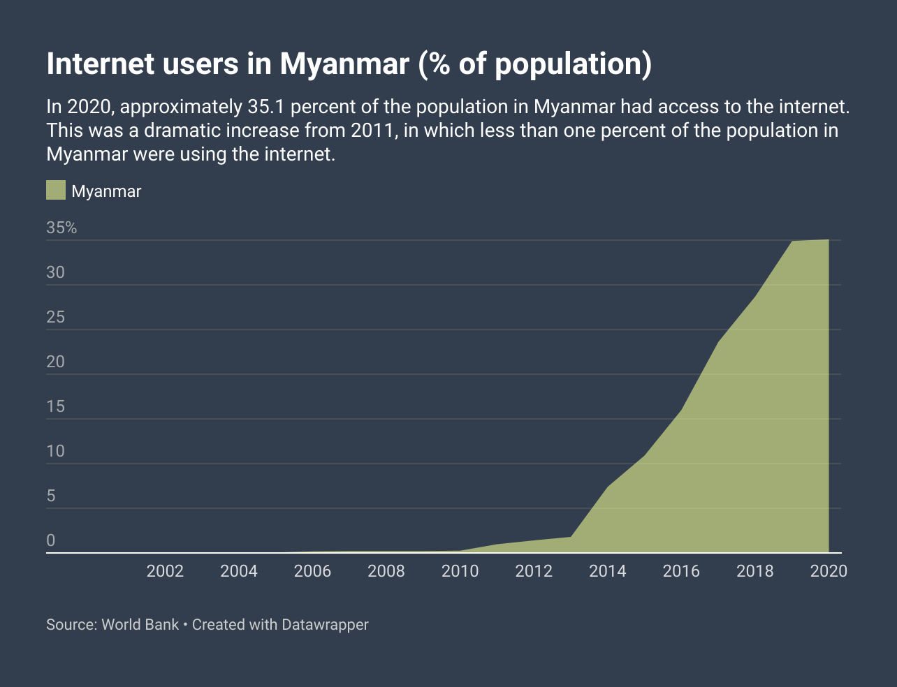 The World Bank. (n.d). Individuals using the Internet (% of population) - Myanmar. https://data.worldbank.org/indicator/IT.NET.USER.ZS?end=2020&locations=MM&start=1990&view=chart ↩︎
