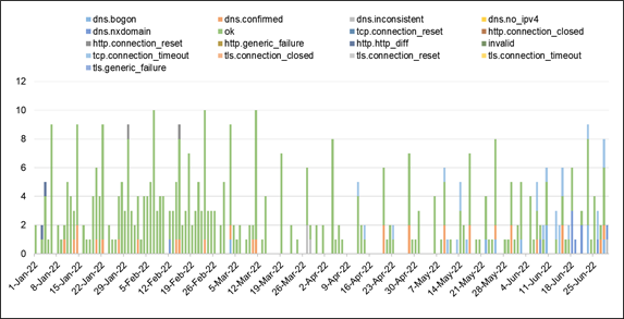 The test results of OONI measurements are determined by the indicators listed in Table 2. Table 3 shows the breakdown of OONI measurements on web connectivity, instant messaging and circumvention tools from January to June 2022.