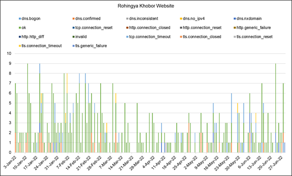 During the first half-year of 2022, 753,018 OONI measurements were collected from 2,130 websites through 37 vantage points in Myanmar. From this total, it was seen that 88.8% (668,881) were OK, 9.9% (74,711) were anomalies, 1.1% (7,953) were failed measurements and 0.2% (1,473) were confirmed blockings.