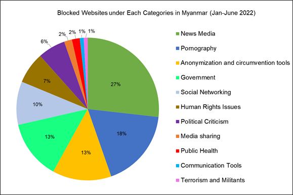 The following chart illustrates the blocking of websites of 11 categories in Myanmar from January to June 2022, based on OONI data.